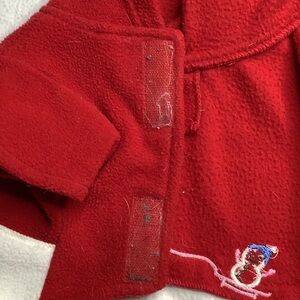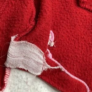 Item shows some signs of wash and wear; hook & loop fasteners have some fuzz; super soft, cute, and warm; stylish pointed hood.