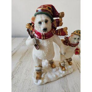 about 10-in tall by 8 in by 5-in, overall in good condition except for the smaller polar bears missing part of his hat socking