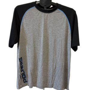 Classic Polaris logo tee featuring a stylish gray torso, black raglan sleeves, and bright blue piping/logo accents. This comfortable short-sleeve shirt is perfect for casual wear, outdoor adventures, or showing off your off-road enthusiasm. It has a crew neck and a large, vertical Polaris logo screen-printed on the side. Great sporty, athletic style.