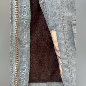 Removable hood with removable fur trim, fleece lined, adjustable waist, zip and Velcro closure, Velcro cuffs.