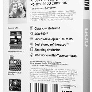 Got a vintage camera? This is your film. Our black and white 600 film has a battery to power the Polaroid 600 cameras from the past. 8 instant photos rich in bright whites and deep blacks to bring an edge to portrait and party moments.