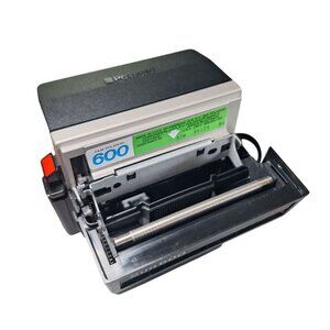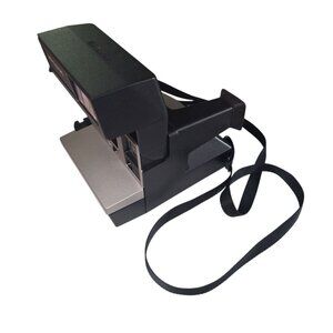 Vintage Polaroid Sun600 LMS Camera with pop-up neck strap. Perfect for photography enthusiasts and collectors. Made in the USA, this black camera combines classic style with functionality.