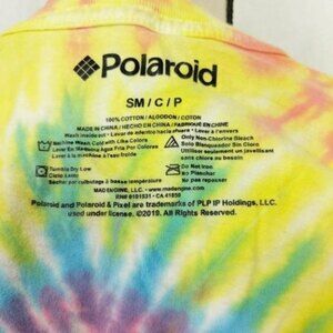 Polaroid. Twirl tie dye crop top, short sleeves, yellow, pink, blue, purple, green, white, black graphic Polaroid camera. Good condition. Size S.