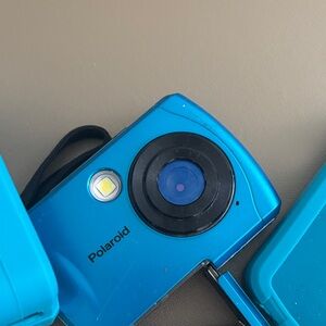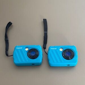 Pair of vibrant blue Polaroid cameras. Equipped with black straps for easy carrying.