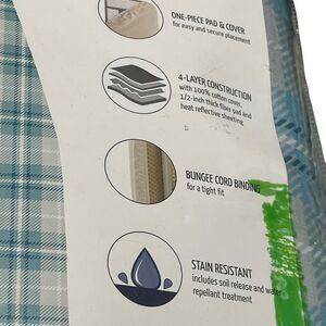 Blue plaid ironing board cover. Features stain resistance and water repellency.