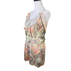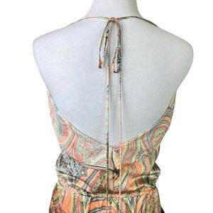 Poleci Satin Multi Color Paisley Print Ruffle Accent Open Back Halter Tie Romper