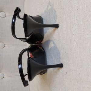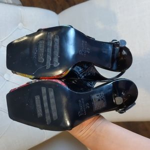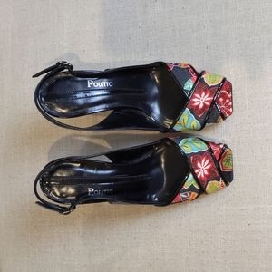 Lightly worn size 35 Poletto open toe slingback heels. Beatiful floral fabric toe area with black sling back and heel. Minimal wear on bottom of shoes as seen in photos.