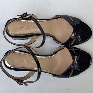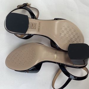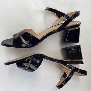 New no tags. Size 38 / 7. Black patent leather with gold detailing at top of heels. Heel height 2 1/4”.