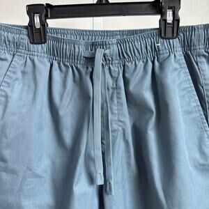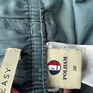 These are pre-owned Polham Easy shorts, size 30, in a light blue color. They feature an elastic waistband with a functional drawstring. The shorts have two front pockets and one back pocket. The material appears to be cotton or a cotton blend. There are no visible stains, tears, or significant imperfections. The overall condition is good.