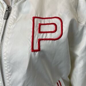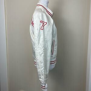 Really cool, vintage looking creamy white satin jacket with red letters. No stains, tears or holes