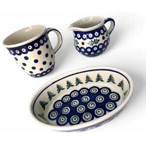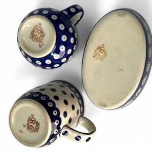 Polish Pottery 3 Piece Set Hand Painted Poland Stamped Coffee Cup Creamer