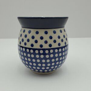 Polish Pottery Dot Around Mug. Ceramika Artystyczna Boleslawiec Blue and White Polka Dot Bubble Mug. Unikat piece in excellent pre-owned condition. 4.25" tall, 3.75" across the top.