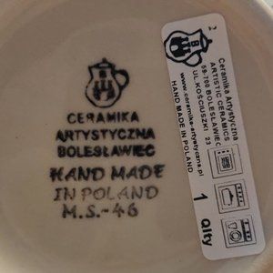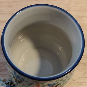 Many uses for this adorable container, kitchen ..sugar, salt , different seasonings, olives, salsa to store left overs in the refrigerator . Bathroom...Q-tips, cotton balls, hair clips/bands/ties, tweezers, eye lash curler, make up or store make up brushes with the lid off. Office/art use without lid on...stamps, paper clips, rubber bands, staples, staple remover pens, pencils, rulers paint brushes, tubes of paint . This is truly a multi use container. It is oven, microwave, dishwasher and refrigerator safe. Polish Pottery jar with lid is made by talented artisans from Poland. It is 6.3" high and measures 4.5" by 4.5". It holds 20 ounces of fluid.H5106K-37