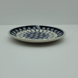 Polish Pottery Peacock Leaves Salad Plate. Peacock Blue Green Circles Dessert Plate. 7.5". Excellent pre-owned condition.