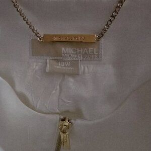 Step out in sleek, modern style with this crisp white MICHAEL Michael Kors jacket! Features luxe gold zipper detailing on the chest and pockets, plus a tailored silhouette that hits right at the waist. Made from a cotton-spandex blend for a structured yet comfortable fit. Perfect for layering over dresses, jeans, or jumpsuits. A polished must-have for spring & fall!