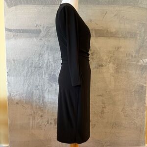 This sophisticated black dress by Anne Klein features a pleated wrap design with a flattering v-neckline and long sleeves, perfect for cocktail or work occasions. The sheath silhouette offers a polished look, while the structured fabric ensures a sleek fit.
