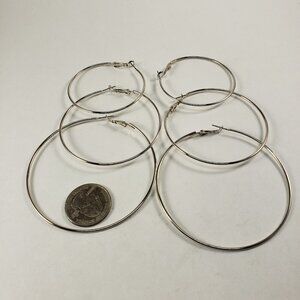 Polished Silver tone 3 pairs of big graduated Hoop Sizes Earrings