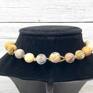 A stunning polished stone necklace crafted from a series of marbled stone beads in swirling natural colors of beige, taupe, yellow & gold, with subtle pops of greens and blues. At the back of the neck, one bead fits through a loop decorated in yellow seed beads to close securely (photo 1). This necklace has a nice weight to it and looks so elegant. Excellent preowned condition.