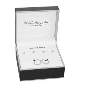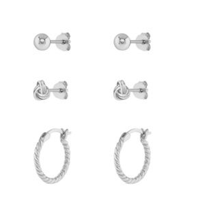 A trio of beauty from Macy's, this set of polished earrings features a pair of polished ball studs, loveknot studs and rounded out with braided hoops.