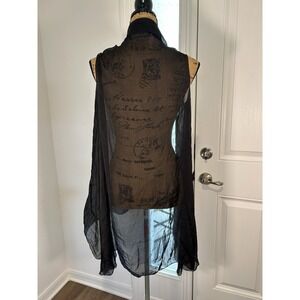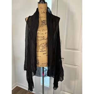 Not sure vest is the correct term, like a shawl with arm holes, maybe close to a cape but made of sheer fabric. Fabric tag shows a silk/viscose blend but no size tag found. Best estimate is size Small.