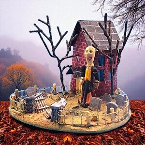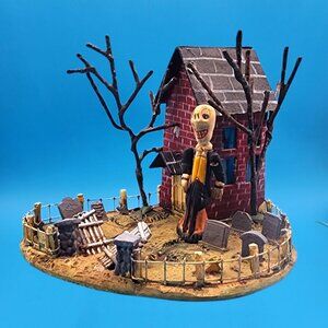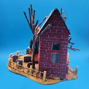 Bring a touch of spooky charm to your Halloween display with this rare 1990s Poliwogg’s Haunted Skeleton Cemetery House by Salamander Graphix. Featuring a hand-painted red brick house, crooked trees, gravestones, and a whimsical skeleton figure, this collectible miniature is perfect for fans of vintage Halloween décor. A unique piece to add to your haunted village, mantle, or seasonal display.