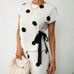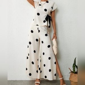 Polka Dot Batwing Sleeve Top & Split Thigh Wide Leg Pants
