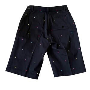Black bermuda shorts with fun rainbow colored polka dots all over, pockets, belt loops, zip and button closure, high rise, missing brand and size tag. Excellent preowned condition