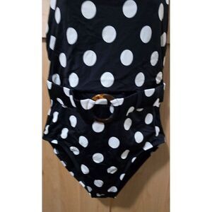 Polka Dot Black & White One-Piece Swimsuit With Belted Waist & Adjustable Straps