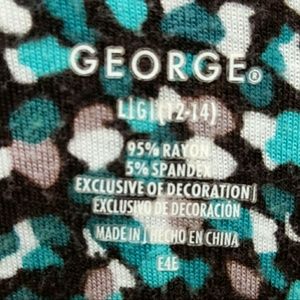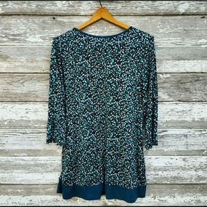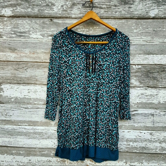 Polka dot blouse in turquoise, white, gray, cyan, and black by George. Size is large. Material has stretch. 3/4 sleeve. Bottom strip is turquoise with black polka dots. Scoop neckline. Front under mid neckline is pleated with black lace and three small black buttons.