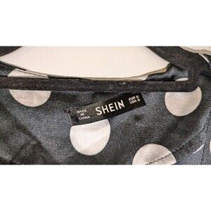 The product is a women's black and white polka dot blouse with a deep V-neck design, featuring a 3/4 sleeve length and ruffle accents. Made from polyester with a down fabric type, this button-down pullover blouse in size small is perfect for office wear. The regular fit top from the brand SheIn offers a colorful and stylish look, suitable for all seasons.