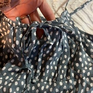 Light blue with white polka dots, tie front, adjustable spaghetti straps, snap closure on bottom