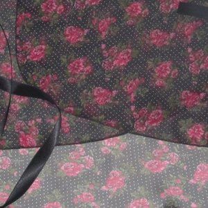 Black chiffon dance skirt with tiny white polka dots and pretty flowers in shades of pink. XL/2X Size- 20 inches long, tapers to the front; 48 inch waist; 48" waist, is measured at the natural waist, not hip, please allow approximately 6-8 inches for overlap. Available in other sizes. Made in the USA