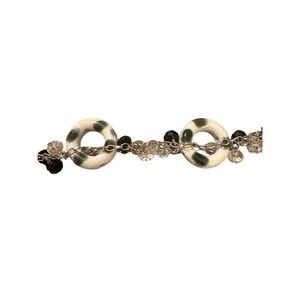 Playful polka dot glass circle beads intertwine with silver chain and black and clear crystals.