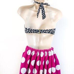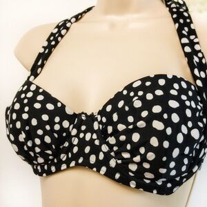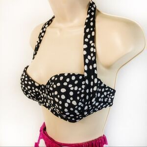 Glamorous Hollywood vibes with this black halter bikini top with white polka dots. Pleating on the cups creates an illusion of a larger bust while the straps tie around the neck, ensuring the top to stay in place. Also has a back strap with an extra large bra hook in shiny gold-tone.