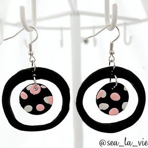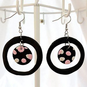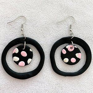 sea la vie boutique hand crafted polka dot hollow out dangle earrings cut-out round dangling earring set white & blush ballet pink polka dotted print overlays a dark black backdrop contrasting solid black outer ring/hoop polished silver-tone metal hardware lightweight & comfortable design dangle earring design with wire hook silver metallic HYPOALLERGENIC materials- • made with iron metal pendant measures approx. 1.5" hook measures approx. 0.7" total drop length approx. 2.2" ships on paper earring card sealed in protective plastic bag for added security *for PIERCED EARS only* brand new, never worn nwt | new new to poshmark? sign up using code SEA_LA_VIE for $10 off your first purchase! hand made handmade handcrafted boutique vibrant pastel watercolor tie-dye ombre ombré gradient swirl swirly printed patterned baby pink ballerina pastel neon bright vibrant colorful funky bold party cute chic girly sweet boho bohemian gypsy indie hipster simple basic classy timeless elegant must-have unique one-of-a-kind