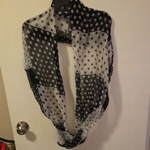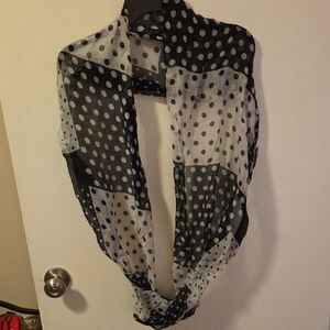Elevate your style with this chic polka dot infinity scarf. Featuring a classic black and white design, it's perfect for any occasion.