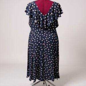 Chic navy dress with playful lavender polka dots. Perfect for any occasion.