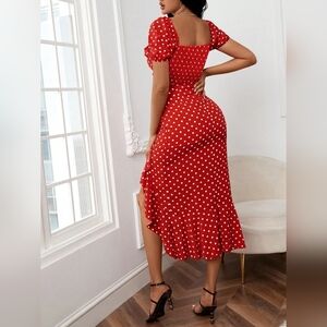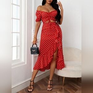 Polka Dot Off Shoulder Drawstring Crop Top & Ruffle Asymmetrical Hem