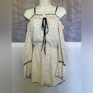 Chic off-shoulder top with a playful polka dot pattern. Features a stylish tie-front detail and comfortable fit. Perfect for casual outings.