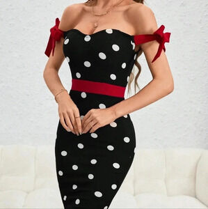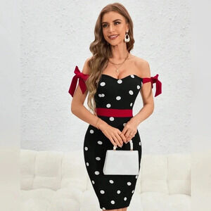 Polka Dot Print Off Shoulder Knot Detail Bodycon Dress