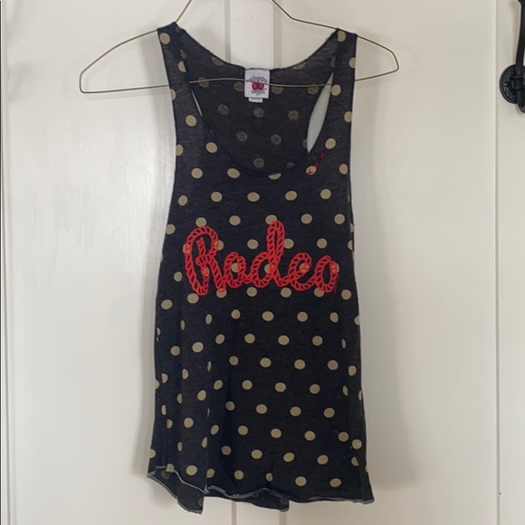 Super cute polka dot tank from Bohemian Cowgirl with stitching detail along the neckline. Rodeo get-up!