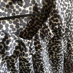 Banana republic long sleeve blouse with polka dots (navy blue) and ruffle detail around the neckline, shoulders, and sleeve ends.