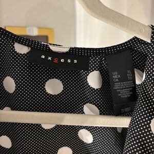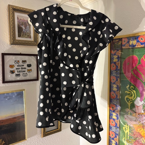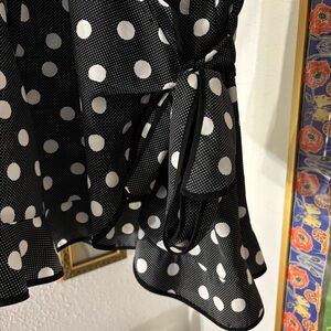 Early 2000s black & white polka dot wrap top. Tie is adjustable so it can fit a variety of sizes!