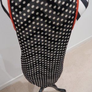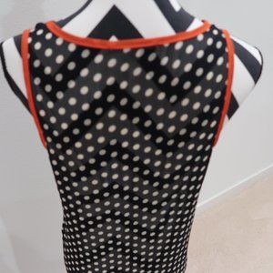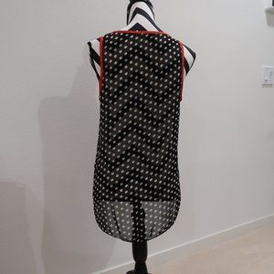 Sleeveless Top Polka Dot Design Long Back Hem Button Details 100% Polyester Black with White Polka Dots and Red Orange Trim
