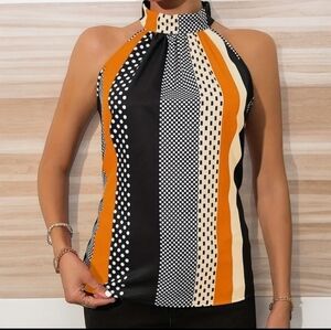 Polka dot halter top, striped sleeveless top, colorblock top, chic halter neck top, high neck blouse, casual sleeveless top, summer fashion top, trendy women's top, polyester top, no stretch blouse, black and orange top, polka dot fashion, striped fashion, casual chic top, lightweight top, sleeveless fashion, high-neck halter, dressy casual top, bold pattern blouse, trendy halter top, fashion forward top, stylish women's top, modern halter neck, women's clothing, women's tops, trendy blouses for women, casual wear, evening wear, Spring