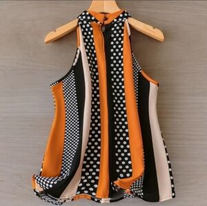 Polka dot halter top, striped sleeveless top, colorblock top, chic halter neck top, high neck blouse, casual sleeveless top, summer fashion top, trendy women's top, polyester top, no stretch blouse, black and orange top, polka dot fashion, striped fashion, casual chic top, lightweight top, sleeveless fashion, high-neck halter, dressy casual top, bold pattern blouse, trendy halter top, fashion forward top, stylish women's top, modern halter neck, women's clothing, women's tops, trendy blouses for women, casual wear, evening wear, Spring