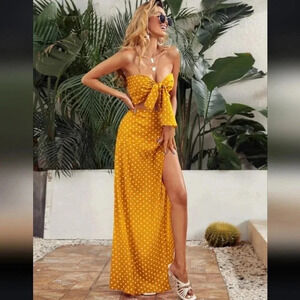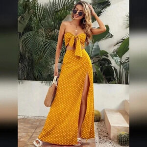 Polka Dot Tie Front Crop Tube Top & Split Thigh Skirt Set