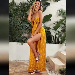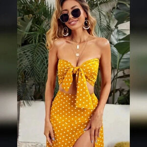 Polka Dot Tie Front Crop Tube Top & Split Thigh Skirt Set
