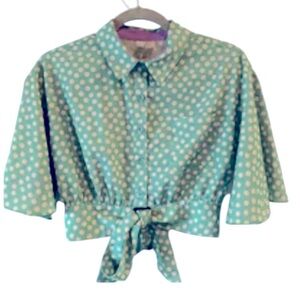 Chic and stylish, this green polka dot blouse is perfect for any occasion. The tie-front design adds a trendy touch. A must-have for your wardrobe.( pit2pit 18” length 15” approximately)( WT-55)