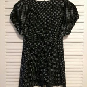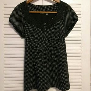 Fun, classic black and white top with back tie waist, decorative buttons and lace on cheat and short sleeves. Flairs out some towards the bottom for a more free fit. Such a great top that will work with many different bottoms! Great condition! From Kohls